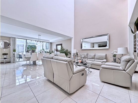 From the moment you step inside, you’re welcomed by an elegant foyer that opens into a stunning living room with double-height ceilings, seamlessly flowing into the dining area framed by floor-to-ceiling sliding glass doors. The architectural design, enhanced by skylighting and designer lighting fixtures, fills the home with abundant natural light while creating a bright, airy, and sophisticated atmosphere.