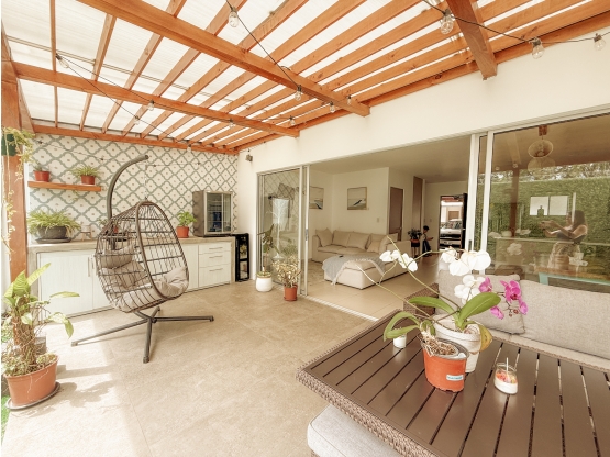 Casa de tres habitaciones, sala, comedor y cocina integrada. Cuenta con una terraza con jardín encantador, ideal para reuniones sociales o como espacio de trabajo. Aire acondicionado en el dormitorio principal y una habitación con escritorio. Área de lavado con lavadora y secadora. Garaje para dos autos.